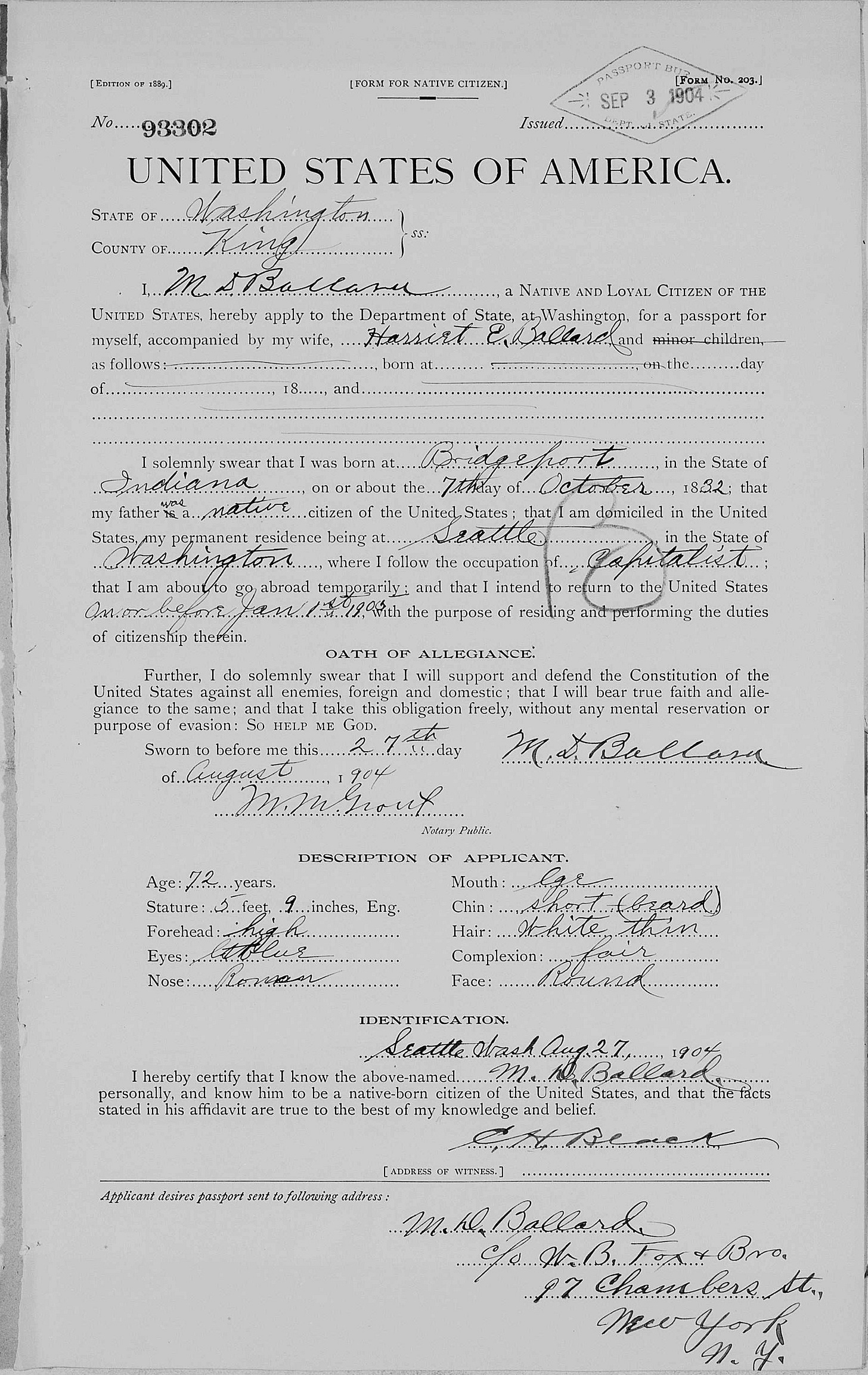U.S. Passport Application for Martin Dickerson Ballard, Passport No. 93302, issued September 3, 1904, State of Washington, King County; National Archives and Records Administration, Washington, D.C.