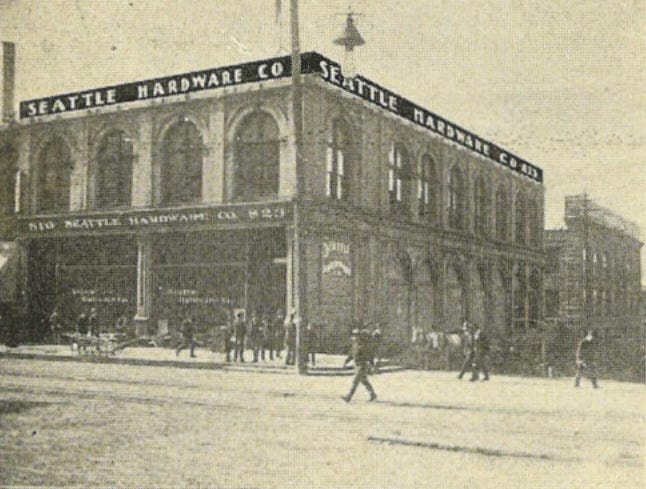 Seattle Hardware Company Building: Public domain image via Wikimedia Commons (https://commons.wikimedia.org/wiki/File:Seattle_Hardware_Co._-_1900.jpg).